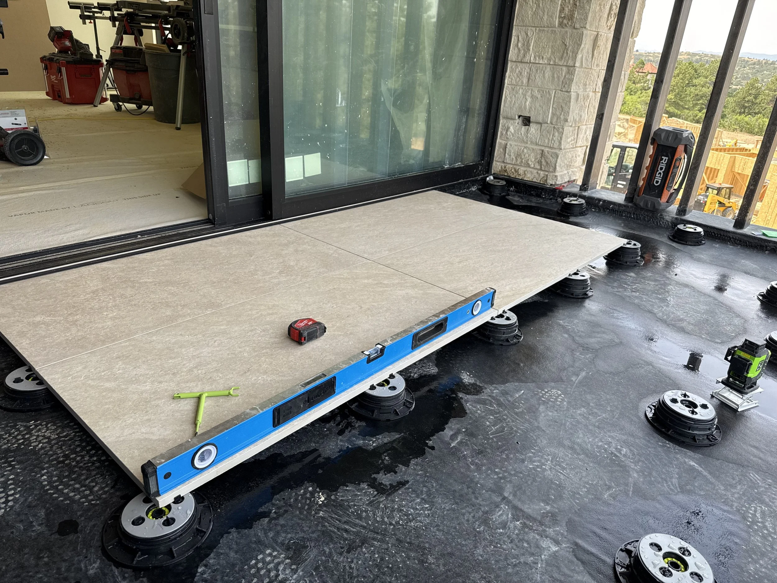 Instead of setting pavers directly in mortar or sand, porcelain or concrete pavers are installed on adjustable pedestal supports. This creates a perfectly level walking surface while allowing water to drain freely underneath—eliminating pooling, freeze-thaw damage, and long-term settling.